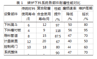 表1数据表明,复合耐磨合金技术使各关键部件使用寿命提升67%~118%,系统整体磨损速率降低47%,维护周期延长70%,充分验证了该技术对转炉下料系统性能的积极影响。