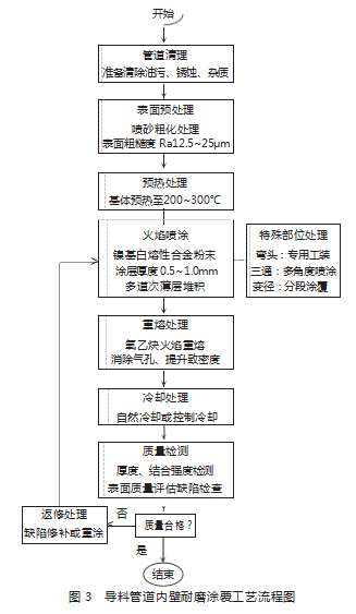 导料管道内壁会承受高速物料流长时间持续冲刷与磨损,耐磨涂覆技术可通过表面改性明显改善管道表面性能,如图3所示。涂覆材料选用镍基自熔性合金粉末,利用火焰喷涂工艺能在管道内壁形成致密耐磨保护层[4]。涂覆层厚度控制在0.5~1.0mm,这样既能确保有足够耐磨保护又能维持管道原有流通截面。预处理工艺包含表面喷砂粗化以及预热处理,可确保涂覆层与基体有优异结合强度,喷涂参数的精密调节是涂覆质量的关键影响因素,优化喷涂距离、角度、移动速度等工艺参数可实现涂层组织致密化。涂覆层组织呈现典型的层状结构特征,硬质相颗粒均匀分布在其中形成抗磨骨架。后处理工艺采用重熔技术,氧乙炔火焰重熔处理能消除涂层中的气孔缺陷,并提升涂层致密度与结合强度。管道弯头等特殊部位使用专用工装与分段涂覆工艺,以此达到涂覆质量的均匀性与完整性。