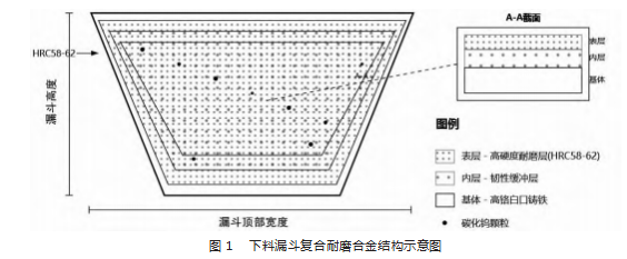 下料漏斗作为转炉下料系统核心入口部件,需承受大块原料的剧烈冲击载荷与高温环境的协同作用,其复合耐磨合金选材与设计需重点聚焦抗冲击韧性及高温热稳定性协同优化。漏斗内表面采用高铬白口铸铁基复合合金,通过精准添加钨(W)、钼(Mo)等合金化元素,调控合金相组成与分布,显著提升材料高温力学强度、硬度及抗热疲劳性能。微观结构设计上,合金基体中弥散分布的碳化钨(WC)硬质颗粒形成连续耐磨骨架,析出的碳化铬(Cr3C2)强化相进一步提升了抗氧化性与抗腐蚀能力[2]。漏斗底部锥形区域磨损最严重,采用梯度复合结构设计,如图1所示,表层硬度达到HRC58~62,内层保持适当韧性以吸收冲击能量,选材过程中考虑材料可焊接性与可加工性,合金成分中添加微量钒、铌元素细化晶粒组织,优化材料综合性能。
