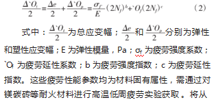 基于热-力耦合分析得到的应力-应变历程,本研究采用基于应变的疲劳分析方法对钢包低周热疲劳寿命进行预测。该方法尤其适用于温度循环引起的大应变低周次疲劳问题。首先,通过分析确定钢包耐火材料在循环中承受最大交变应变的危险点,通常位于渣线部位或包底与包壁的连接处。然后,提取该危险点在一个稳定工作循环内的应力-应变迟滞回线,获得总应变范围Δ`Ot。采用Manson-Coffin公式对疲劳寿命进行计算,该公式关联了总应变幅与疲劳失效循环数Nf[4],如式(2):