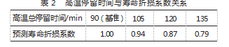 对于周转时间,优化核心在于缩短钢水在包内的高温总停留时间。通过优化生产调度,实现LF精炼、吊运与连铸开浇等环节的准点一体化衔接,可明显缩减钢包的非作业等待时间。基于模型的敏感性分析,可制定不同高温停留时间对应的预期寿命折损系数,具体如表2所示。