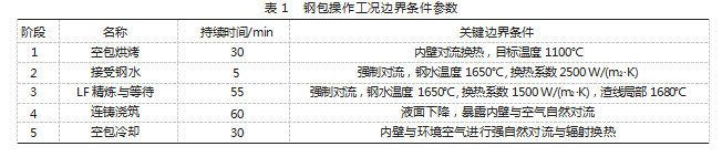 将实际的钢包操作工况转化为FEM模型可识别的边界条件,是实现精确仿真的核心步骤。本研究将一个完整的钢包操作循环分解为一系列离散的阶段,并对每个阶段的关键热力学参数进行量化设定,包括空包烘烤、接受钢水、在钢包精炼炉进行精炼与等待、连铸浇筑以及最终的空包冷却[3]。
