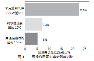 基于已建立的热-力耦合有限元模型及寿命预测方法,对不同操作工况如何影响钢包热疲劳寿命进行了定量分析,结果如图1所示。