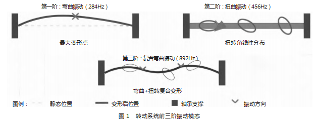 图1结果显示,前六阶固有频率分布呈明显阶梯状,第一阶弯曲模态频率为284Hz,且振型显示主轴中部有横向弯曲变形,该模态对系统横向激励最为敏感。第二阶扭转模态频率为456Hz,主要影响齿轮轴角位移响应。第三阶和第四阶模态频率分别是678Hz和892Hz,对应复合弯曲和扭转振动模式。较高阶模态集中在950~1250Hz频率范围,且振型复杂程度显著提高,主要与轴承支撑部位局部振动有关,模态参与因子分析表明,前三阶模态有效质量占总质量85%是决定系统动态响应主要因素。