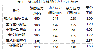 主轴中部截面的应力分布呈现出较为均匀的状态,安全系数高达4.08,表明该部位具有足够的强度裕量。动态应力分析的结果显示,在高速运转的条件下,各个部位的应力幅值普遍增大了40%~60%,其中轴承配合面和齿轮啮合区域的应力波动最为剧烈。