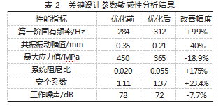 由表2可知,系统各项动态性能指标都有显著改善,第一阶弯曲模态频率提升9.9%,有效避开工作频率范围,共振幅值降低40%,振动控制效果十分明显。最大应力值降低18.9%,让安全系数提升至1.37,增强了结构的可靠性。系统阻尼比提升175%,大幅增强了振动衰减能力。工程应用验证表明,优化方案使设备故障率降低60%,并延长了维护周期,带来显著经济效益。