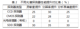 利用CCD或者CMOS探测器代替常规的光电倍增器,可以有效地提升探测的灵敏度和分辨力,达到多组分同步探测的目的,如表2所示。CCD、CMOS探测器具有大动态范围、高量子效率等优势,可提高原子的高探测精度,降低探测错误。采用高精度硅位移探测器(SDD)可以有效地增强X射线荧光的能谱解析力,减少谱线的交叠,从而提升分析精度,为实现复杂样本中的元素精准测定奠定基础。