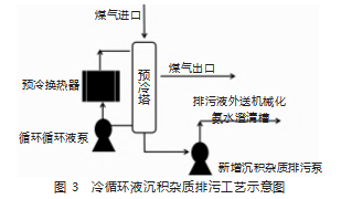 在煤气预冷塔最底部安装DN100管道,使用专用排污泵,连续将其富含焦油、煤粉、焦油和其他重质成分的杂质,抽出输送至冷鼓工段机械化氨水澄清槽,同时此泵也可以起到预冷置换液水平衡控制的作用。其工艺流程如图3所示。