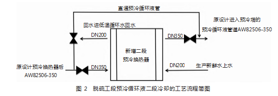 现有四台预冷换热器后预冷循环液,首先进入新增二段预冷螺旋板换热器,经过13~16℃外来生产新鲜水冷却后,进入现有预冷塔喷淋段冷却焦炉煤气。新增预冷二段循环液冷却器,设计有直通阀门,如果现有预冷换热达到规定温度或者检修维护时,可以流经此管道。经过新增预冷二段冷却后的25~30℃回水,送至低温循环水系统,如图2所示。