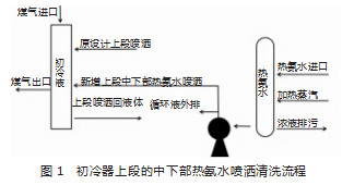 提高初冷器上段循环喷洒流量[3],按照横截面积4~6m3/h进行调整,做到生产过程中的连续冲洗净化。同时在初冷器上段的中下部设计安装热氨水喷洒清洗组合喷头,有效防止初冷器下段的焦油渣、萘、焦粉、煤粉等杂质沉积,如图1所示。改造后,工况没有改变,初冷器阻力从1.5~2.2kPa降低至0.6~0.8kPa。