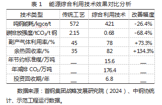 如表1所示,能源综合利用技术跟传统冶金工艺相比在节能减排方面有显著优势,碳排放强度大幅降低验证了该技术路径的有效性,经济效益分析表明,这项技术通过提升副产气体利用率以及余热回收率实现了能源成本的有效控制,年节约标准煤15.6万吨,达到预期目标,投资回收期6.8年,处于合理区间范围内,具备良好的经济可行性,为钢铁企业低碳转型提供了技术与经济双重保障。