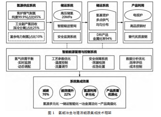 氢能冶金技术基于现有氢源构建了多元化氢气供应体系,涵盖焦炉煤气制氢与工业副产氢回收及现有电力富余时段电解水制氢等技术路径,工业副产氢通过深冷分离技术实现高效回收,电解水制氢系统利用厂区自备电厂低谷时段富余电力,与其他氢源形成互补供应体系[4]。某钢铁集团氢能冶金示范工程建设了综合制氢系统,日产氢气能力达到150吨,其中焦炉煤气制氢占比65%,副产氢回收占比25%,富余电力制氢占比10%。如图1所示,氢能冶金与清洁能源集成技术框架包含氢源供应、储运系统、冶金反应以及产品利用四个核心环节,通过智能能源管理与控制系统实现各环节的协调优化。氢气储存采用高压气态储氢方式,储氢压力20MPa,储氢容量8000m3,配备自动化氢气输送管网保障竖炉连续稳定供氢,竖炉反应器采用多点供气技术确保氢气分布均匀,直接还原铁产品金属化率稳定在94%以上。该技术体系通过统一的能源管理平台实现多能源协调优化,将整体能源利用效率提升22%以上,为传统冶金工艺向低碳氢冶金工艺转型提供了完整的工程解决方案。