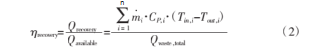 冶金生产过程产生的余热资源具有温度跨度大、品位差异大的特点,烧结机余热温度能达到350~450℃,轧钢加热炉余热温度为200~300℃,炉渣显热温度高达1400~1500℃。梯级利用技术根据余热品位差异设计了多级回收方案,将高品位余热优先用于蒸汽发电,中品位余热用于原料预热以及工艺加热,低品位余热则用于厂区供暖以及生活热水制备。某钢铁企业余热梯级利用系统采用三级回收设计,一级回收利用烧结环冷机余热进行蒸汽发电,装机容量15MW,年发电量1.2×108kW·h;二级回收利用轧钢余热对连铸坯进行预热,预热温度提升至200℃;三级回收利用低温余热供给办公区域采暖系统[3]。余热梯级利用系统的能量回收效率计算公式为式(2):