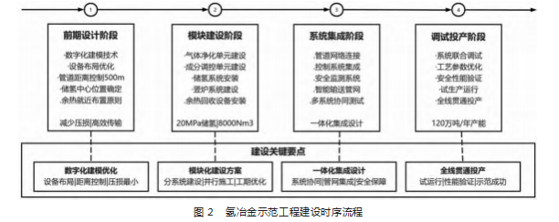 能源综合利用技术在钢铁冶金行业的工程应用需要多系统协同建设以及全流程优化控制,某大型钢铁集团120万吨氢冶金示范工程采用了模块化建设方案,将副产气体回收系统、余热梯级利用系统以及氢冶金生产系统进行了一体化集成设计。如图2所示,工程建设按照前期设计、模块建设、系统集成以及调试投产四个阶段有序推进,总建设工期17个月。借助数字化建模技术优化了设备布局,气体净化装置与竖炉系统距离控制在500m以内减少管道压损,余热回收换热器采用就近布置原则实现热能高效传输,氢气储存设施配置在生产区域中心位置确保供气半径最小化。工程建立了多参数耦合控制系统以优化运行,通过实时监测副产气体成分变化动态调整净化工艺参数,根据余热温度波动情况自动切换梯级回收模式,依据生产负荷需求智能调节氢气供应流量以及压力等级[5]。系统集成控制平台实现气体流量与温度分布以及氢气浓度的精确协调,整个示范工程年运行时间达到8200h,设备综合效率保持在92%以上,为能源综合利用技术的规模化推广提供了完整的工程示范。