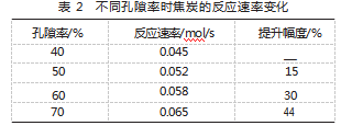焦炭孔隙结构的改善对还原反应速率的提升有着明显的效果。合理控制焦炭的孔隙率、孔隙形态及分布情况,可以有效地加快气体的扩散速率以及固-气接触效率,推动还原反应的进程。相关研究显示,优化焦炭的孔隙结构能够明显提升反应速率。在实验中,焦炭孔隙率由40%增长到50%时,反应速率可提升15%;孔隙率上升到60%时,反应速率提升30%[4]。孔隙结构的优化还包含改变孔隙的形状和分布,保证孔隙在宏观和微观层面上的均一性。优化后的焦炭孔隙结构往往拥有更强的连通性、更大的有效反应面积,使气体分子可以更快地扩散并与固体反应物产生更充分的反应。在高温还原的过程中,优化后的焦炭孔隙结构可以大幅提高还原反应的效率与速度,不同孔隙率时焦炭的反应速率变化情况,如表2所示。