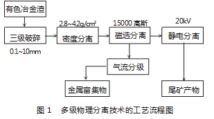多级物理分离技术通过运用破碎和分选联合工艺,达成冶金渣里金属组分的精细分离,如图1所示,三级破碎系统采用颚式破碎机、圆锥破碎机和细碎机串联配置,把废渣粒径从初始的50~100mm,精确控制在0.1~10mm范围内。处理能力分别为150、120、100t/h,为后续分离创造最佳粒度条件。梯度密度分离借助硅铁合金重液介质,建立2.8~4.2g/cm3的连续密度梯度场,重液密度可实现±0.05g/cm3精确调节,分离效率达92%以上,让重质金属颗粒按密度差异自然分层。