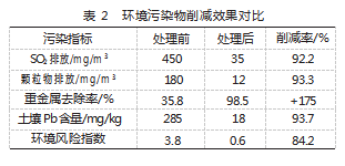 环境改善效果综合分析会依据大气、水体、土壤这三要素,对污染物削减情况做定量评估。如表2所示,SO2浓度从450mg/m3降低到了35mg/m3,颗粒物排放由180mg/m3减少至12mg/m3,重金属离子去除率达到了98.5%。化学需氧量去除率为94.2%。废水回用率提升到了85%,土壤铅含量从285mg/kg下降至18mg/kg,镉含量由65mg/kg减到3.2mg/kg。pH值从5.2调节到了6.8,环境风险评估指数从3.8降到0.6,使得环境质量得到根本改善。