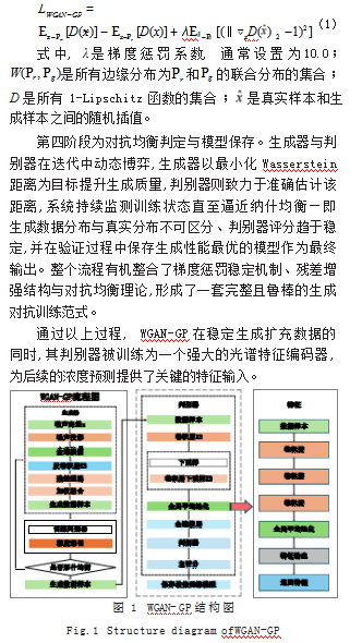 摘要:为满足有色金属冶炼过程中二氧化硫排放的精准监测需求(排放限值12.25ppm),本研究针对实际光谱信号中存在的噪声干扰与标定样本稀缺问题,提出了一种融合预处理优选、数据增强与集成学习的分析框架。实验设定SO2浓度范围10~25ppm,覆盖排放限值以验证方法适用性。该框架首先对比了多种预处理方法,筛选出最优去噪策略以提升信号质量;其次,构建带梯度惩罚的Wasserstein生成对抗网络(WGAN-GP)模型,在有限样本下实现高质量光谱数据生成,并同步从判别器提取深度光谱特征;最后,基于XGBoost、SVM与KNN构建Blending集成回归模型,融合多算法优势以提升预测鲁棒性。实验结果显示,集成模型决定系数达0.954,较最优单一模型提升超过9%,验证了所提框架在小样本条件下对SO2浓度监测的有效性与先进性。