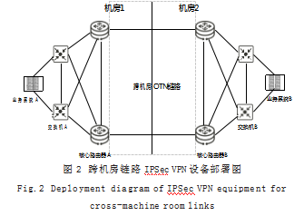根据无线网的总体业务需求,综合考虑跨机房链路所承载的业务情况,以及网络管理便捷性、故障切换简单化、网络改造最小化等多重因素,最终选择采用串联方式、隧道模式设计符合密码应用要求的国密IPSec VPN部署方案,如图2所示。