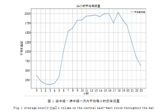 首先,进行数据预处理。运用Python软件对所给数据按交叉口进行分组,得到12个交叉口的相关车流量数据;其次,对各个数据进行拆分,获取每个交叉口处四个相位的数据;最后,计算出经中路—纬中路交叉口一天中平均每小时的车流量(如表1所示),并画出相应的折线图(如图1所示)。