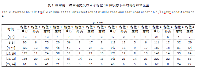 由此可得到经中路—纬中路交叉口[0,6)、[6,9)、[9,17)、[17,19)、[19,22)、[22,24)6个时间段在4个相位共16种状态的平均每分钟车流量,如表2所示。