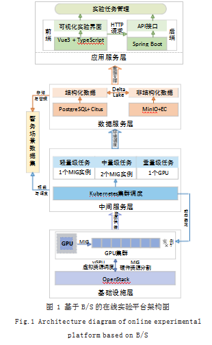 B/S(Browser/Server)架构是一种基于浏览器和服务器的分布式计算模式,无需安装本地客户端即可实现跨平台操作。针对公安院校实验平台的资源管理、任务调度、数据处理等需求,本文基于B/S架构设计在线实验平台,采用云原生技术实现资源弹性调度与跨平台访问,构建包含基础设施层、中间服务层、数据服务层和应用层的平台架构,如图1所示。