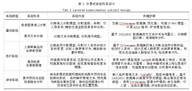 基础实验关注核心工具操作与算法复现,培养学生基础编程能力与理论知识理解力;进阶实验结合多模态任务培养学生对复杂模型的调试能力;综合实验依托多源数据融合与全阶段业务仿真,训练学生的系统性设计思维与警务场景适配能力,如表2所示。