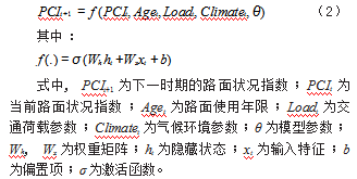 养护决策优化模型综合路面技术状况、交通荷载、气候环境和养护成本等因素,建立全生命周期成本优化框架,采用动态规划算法求解最优养护策略,在满足服务水平的前提下实现成本最小化。路面性能预测采用递归神经网络模型,其预测公式如式(2)所示: