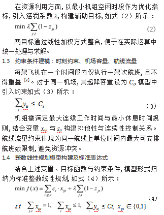 在模型建立前需对排班系统进行合理抽象。假设所有航班需求、机场起降容量、机组资源与飞机状态在排班周期内为已知常量,航班无中断或取消情况[1]。以时间段为单位划分排班区间,定义决策变量xijt表示航班i是否由机组j在时间段t执行,若执行,取值为1,否则为0。引入辅助变量yit表示航班i在时间段t是否起飞,zjt表示机组j在时间段t是否被占用,用于后续约束控制。