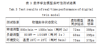数字孪生模型实时性测试通过对比物理实体状态变化与虚拟模型同步更新的时间差实现,测试场景包括水轮机转速从800r/min升至1000r/min、发电机负载从80MW升至100MW、通风设备启动导致环境温度下降[15]。水轮机转速变化时模型同步延迟为72ms,发电机负载变化时同步延迟为68ms,环境温度变化时同步延迟为75ms,模型渲染帧率稳定在38fps,满足实时监控需求。数字孪生模型实时性测试结果如表3所示。
