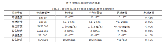 数据采集精度测试采用“标准仪器对比法”,将平台传感器测量值与高精度标准仪器测量值对比[14]。环境参数方面,SHT35温湿度传感器在25℃、60%RH条件下测量误差为±0.12℃、±1.2%RH,PMS7003粉尘传感器在0.4mg/m3条件下测量误差为±0.016mg/m3,MQ-135传感器在CO浓度25mg/m3条件下测量误差为±0.8mg/m3;设备参数方面,ADXL356振动传感器在0.8g条件下测量误差为±0.0004g,PT1000温度传感器在80℃条件下测量误差为±0.08℃,霍尔转速传感器在1000r/min条件下测量误差为±1r/min,所有传感器采集精度均满足设计要求。数据采集精度测试结果如表2所示。
