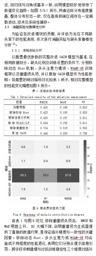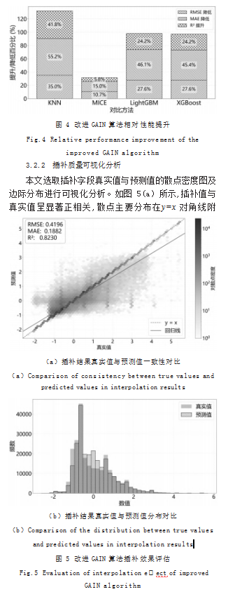 改进GAIN算法通过动态Hint机制与注意力结构增强字段间依赖建模,并结合参数优化提升训练稳定性与插补精度,使用RMSE、MAE、R2等误差指标,并辅以直方图、相关性热力图与散点图等可视化,从数值误差与分布保持两方面综合比较插补效果。最后在统一的随机遮蔽设置下,与KNN、MICE、XGBoost、LightGBM等方法对比评估。