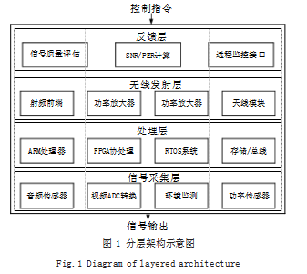 本研究设计的嵌入式广播电视信号无线发射平台采用分层架构,将复杂的信号处理流程分解为四个紧密耦合的功能层次。(1)信号采集层。采用低功耗嵌入式传感器模组直接接入音频/视频源,通过高精度模数转换器(ADC)将模拟信号数字化[4]。该层集成温度、湿度、功率传感器,实现对发射环境的实时监测。(2)处理层。配置多核ARM处理器和FPGA协处理器,处理器执行H.265/HEVC编码压缩、协议栈、控制逻辑;FPGA承担实时流水线任务如滤波、FFT变换、调制编码,确保毫秒级低延迟。该层采用RTOS实时操作系统进行任务调度,支持优先级抢占和中断嵌套,保证关键业务不被打断。(3)无线发射层。该层集成射频前端、功率放大器(PA)、天线模块,直接承接处理层的调制信号,通过自适应功率控制算法动态调整输出功率,平衡覆盖范围与能耗。频谱监测子模块实时扫描周围干扰,反馈给处理层进行动态频道选择。(4)反馈层。构建闭环控制机制。信号质量评估模块持续计算信噪比(SNR)、误包率(PER)等关键指标,通过CAN/以太网向处理层汇报[5]。处理层根据反馈动态调整编码率、调制方式、功率参数,形成自适应优化。同时,该层提供可视化界面和远程监控接口,确保运维人员实时掌握系统状态。四层架构如图1所示。