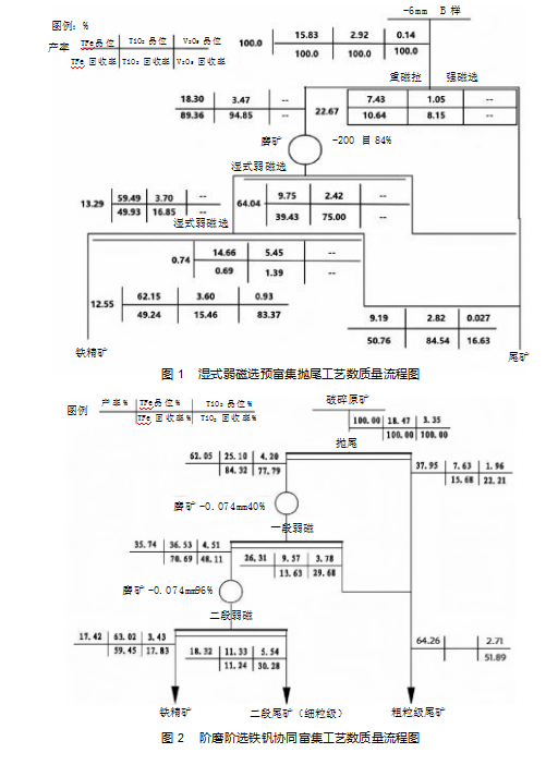 毕机沟矿区针对钒钛磁铁矿原矿品位偏低、矿物组成复杂的特性,采用“干式抛尾-湿式抛尾”两段联合预富集抛尾方案,通过提前分离部分脉石矿物以降低后续选矿工序的处理负荷;原矿经破碎至0~30mm粒级后,首先采用干式磁滑轮进行粗粒抛尾作业,抛尾率达15%,有效剔除大块脉石矿物,随后进入湿式抛尾环节进一步实现预富集。
