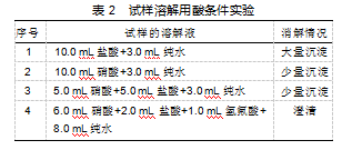 样品中硼元素含量检测的准确性,主要取决于样品的预处理过程中溶解试样是否完全。本次实验使用硝酸、盐酸、氢氟酸进行不同比例组合,对同一样品的试样溶解情况进行比较,如表2所示。