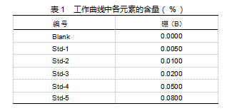 硼的分析曲线在选择上可考察249.77nm、208.96nm、249.678nm特征波长,其中,249.77nm波长的谱线强度最高,但是其附件共存元素干扰比较严重,如FE248.327nm波长有较强的谱线干扰,相比之下208.96nm和249.678nm附件共存元素干扰较少,但是249.678nm的相关系数较208.96nm的好,且线性相关系数r>0.999,故选择B 249.678nm进行测定。