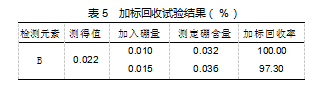 由表4可知,该方法的精密度良好,其相对标准偏差RSD为3.81%。用t检验对以上数据进行计算,硼元素的t值小于t0.05,11=2.23,利用t检验比较测定结果的平均值与标准试样的标准值无显著性差异。因此,文章提出的方法测定平均值与标准物质的真值之间不存在显著性差异,准确度较高。