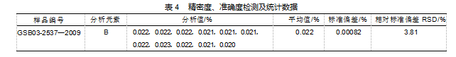 选取硅锰合金标准样品按照试验方法对试样中的硼含量进行测定,标样GSB03-2537—2009进行连续11次重复检测,结果如表4所示。