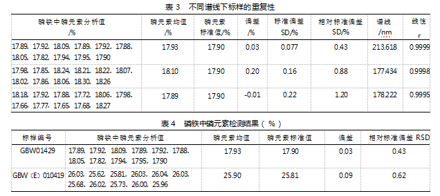 采用该方法检测标样GBW01429和GBW(E)010419的磷元素,检测结果及分析数据如表4所示。