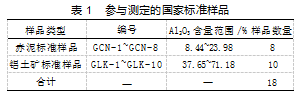 为验证光度滴定仪测定氧化铝含量的准确度与精密度,实验选取18个国家标准样品进行分析,其中包括8个赤泥标准样品(GCN系列)与10个铝土矿标准样品(GLK系列),样品信息如表1所示。