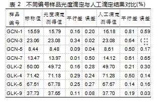 由表2可知,光度滴定法在不同含量样品中均具有高一致性与精密度,除个别样品外,整体表现显著优于人工滴定法。GCN系列平行差不超0.34%,GCN-5误差仅0.04%,对低含量样品仍能稳定识别终点;而人工滴定平行差偏大,GCN-1达0.81%。GLK系列样品中,光度法误差集中于0.08%~0.28%,整体低于人工法。综合统计,光度滴定平均误差为0.19%、平行差为0.18%,总体上优于人工法,充分体现其在不同品位矿样分析中的准确性与可重复性。