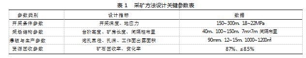 项目以150~300m剖面为研究对象,结合深部浅埋,地应力小(18~22MPa)和岩体相对稳定的特点,采用分期采矿方法。台阶高40m,矿房沿矿体走向布置,长100~150m,宽与矿体厚度相等。采用中深孔爆破法,炮孔直径为90mm,孔深为12~15m,采用7m×7m间隔布置柱支承顶板,工作面出露面积为1000~1200m2。矿体下盘设有分级运输巷道,并与穿脉巷相连,构成运输网络,实现矿石的集中运输。本项目充分发挥浅、中深段围岩的自稳能力,减少支护工作量,达到87%的回收率,贫化率控制在8.5%以内,如表1所示。