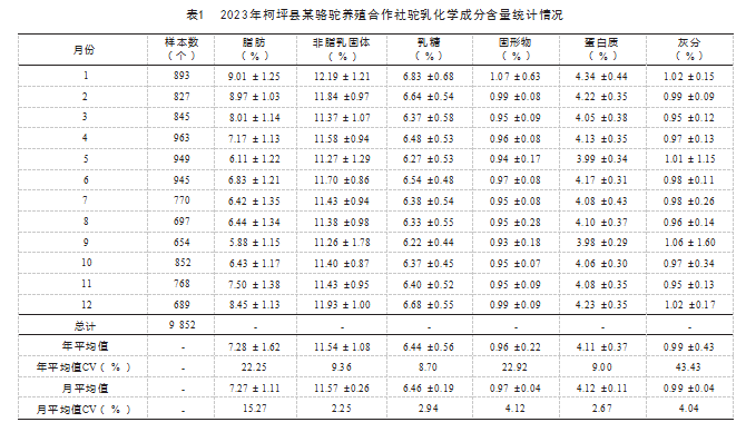 来自新疆柯坪县某骆驼养殖合作社的双峰驼驼乳化学成分含量的正常值范围,见表1。由此可知,脂肪5.88%~9.01%、非脂乳固体11.26%~12.19%、乳糖6.22%~6.83%、固形物0.93%~1.07%、蛋白质3.98%~4.34%、灰分0.95%~1.06%。脂肪、乳糖和蛋白质含量在四季中呈现出明显的规律性变化。乳糖、乳蛋白、固形物和非脂固形物在1—3月呈逐渐下降,9—12月逐渐上升,4—8月呈现波动性变化;脂肪含量在1—4月呈现缓慢下降,9—12月逐渐上升,5—8月呈现波动性变化。即乳糖、乳脂、乳蛋白、固形物和非脂固形物冬季和春季较高,夏季和秋季次之。从各月份的平均变化率(CV)分析,脂肪的月间波动最大(15.27%),其次为固形物(4.12%)和灰分(4.04%),而非脂乳固体(2.25%)、乳糖(2.94%)、蛋白质(2.67%)的月间差异较小,均低于5%。