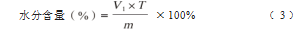 水分的测定:先取甲醇加入反应瓶中,甲醇的量需要在淹没铂电极,打开磁力搅拌器,边搅拌边用卡尔·费休试剂进行滴定到终点。用分析天平称取试样约1 g,记录质量为m,把试样快速加入反应瓶中,摇匀,用卡尔·费休试剂滴定至终点,记录体积为V1(mL),结果按式(3)计算。