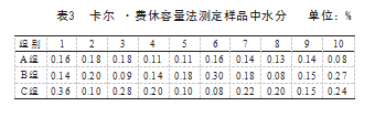 采用卡尔·费休容量法对3组样品分别进行检测,结果见表3。