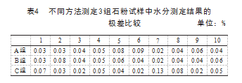 通过表4可知,3组数据分别采用国标直接干燥法、国标减压干燥法和卡尔·费休容量法检测结果的极差均不大于国家标准饲料中水分的测定方法中规定的测定结果绝对差值不大于0.2%的要求,说明3种方法测定的结果差异不大。