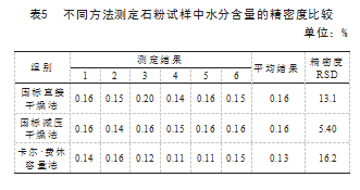 选取A组中1号样品,分别用上述3种方法进行精密度测定,结果见表5。国标减压干燥法精密度结果优于国标直接干燥法和卡尔·费休容量法。