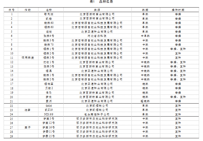 本研究试验材料为饲用燕麦、糜子、油葵,其中饲用燕麦分为春播和复种,品种名录见表1。
