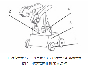 可变式农业机器人主要是由行走单元、控制单元、工作单元、动力单元等单元构成,总体结构设计如图1所示。