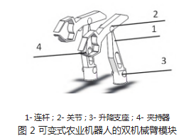 可变式农业机器人的功能区域,可实现于采摘、修剪、播种、施肥、喷洒农药和水等多种农林作业的需求。使用者可根据农作物种类、生长期、地形等不同需求,进行模块的更换。目前产品主要有3种模块,分别是:可变式农业机器人的双机械臂模块(图2),该模块主要用于农作物的采摘以及修剪,包括两对连杆、两个关节、两个升降支座以及两个夹持器,每个夹持器的侧面有两个可用于剪切的高强度折叠刀头,可根据工作需求收起或放下,内侧具有缓冲作用的硅胶条,可以避免抓伤脆嫩的水果(例如苹果、葡萄等),特殊的对称双机械臂的结构设计,工作效率更高。使用者通过控制单元发出工作命令信号后进行工作,例如“采摘命令”,机器人接受命令后对农作物拍照上传前端,前端通过视觉处理系统进行综合处理,判断农作物生长情况和种类,识别成熟果实,在工作区域进行机械臂高度、夹持器角度调节并打开高强度刀头,精准采摘成熟果实[4-5],同时可将采摘的果实放到指定位置。
